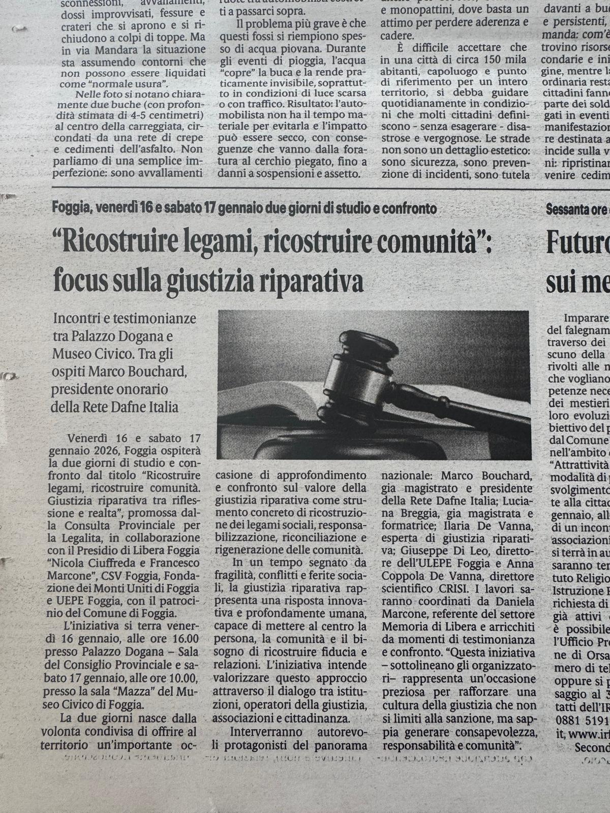 FOGGIA – Ricostruire legami, ricostruire comunità: focus sulla giustizia riparativa (Rete Dafne Italia, Consulta Provinciale per la legalità, Presidio Libera Foggia, Fondazione dei Monti Uniti Foggia, UEPE Foggia, Comune di Foggia)